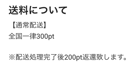 しかし、配送処理完了後に200ポイントが返還されるため、実質の送料負担は100ポイント(100円)で済みます。